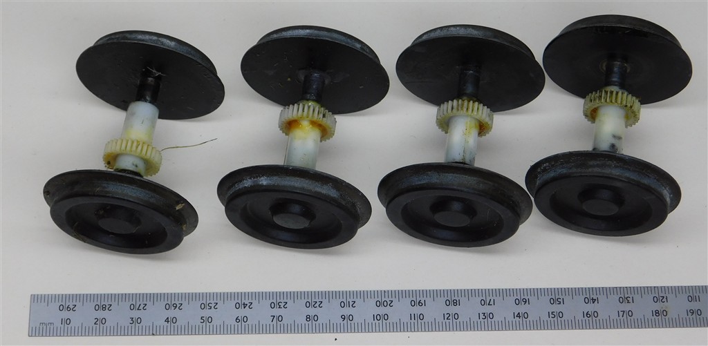 4 axles G scale 38mm diameter diesel loco driving wheels, make and type unknown, ruler not included