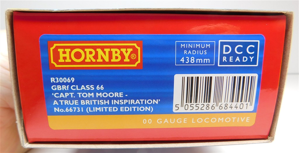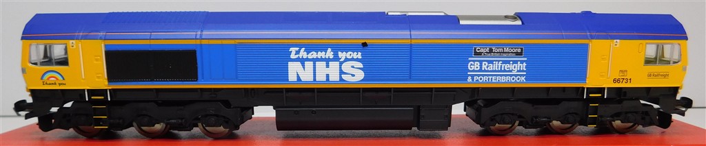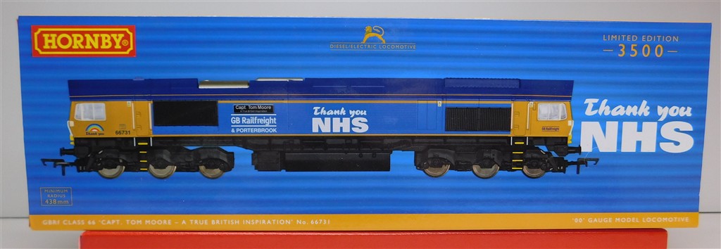 A Hornby R30069 GBRf class 66 number 66731 Sir Tom Moore, one bogie doesn't sit right, cause needs investigating and fixing, good runner, in good clean cosmetic condition, supplied in the original box, sold as a project needing work!