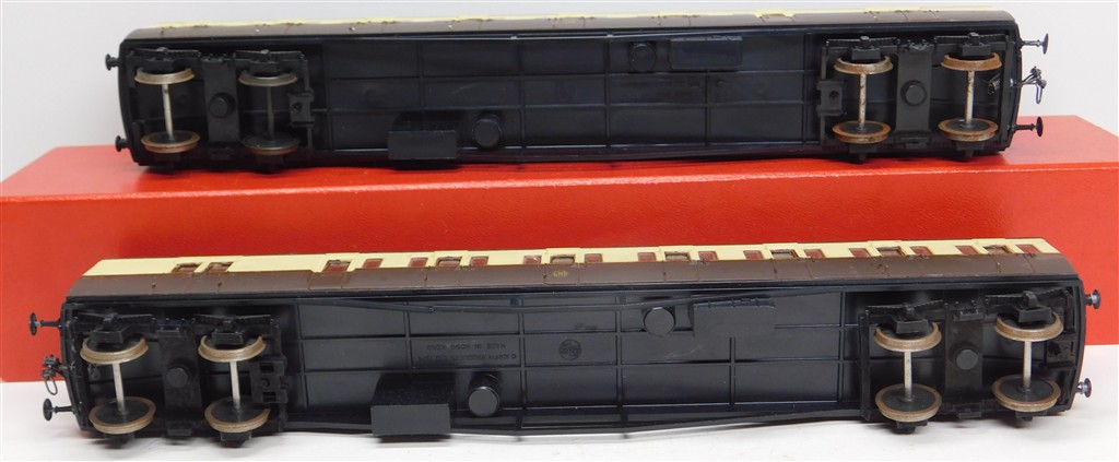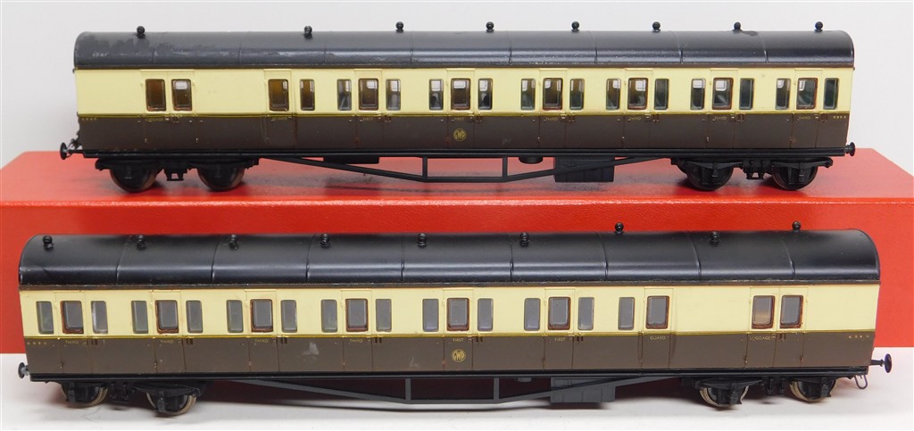 EM and P4 Gauge: Pair of Airfix GWR B unit coaches with 3 link couplings and EM gauge wheels