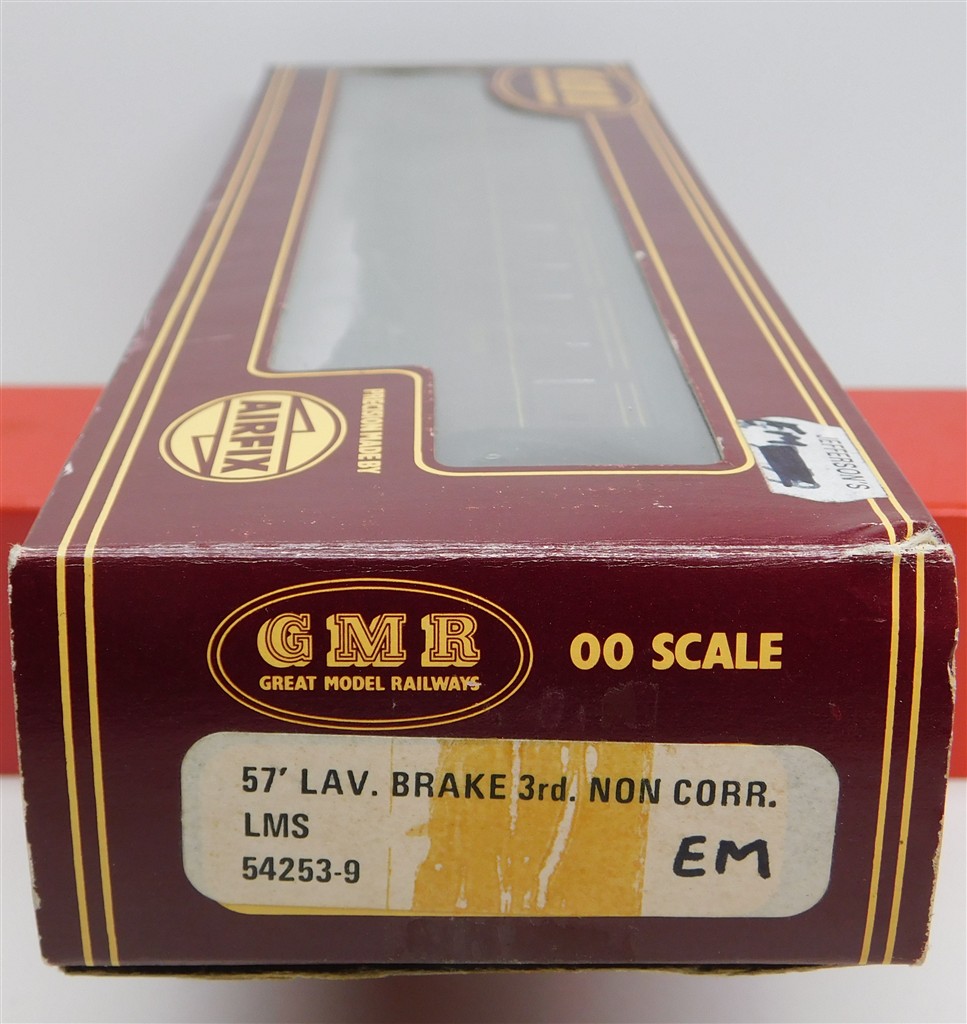 An Airfix LMS non-corridor 3rd class coach with 3 link couplings and EM gauge wheels, coupling mounts removed from the bogies, supplied in the original box, note this will not run on 00 track without changing the wheels