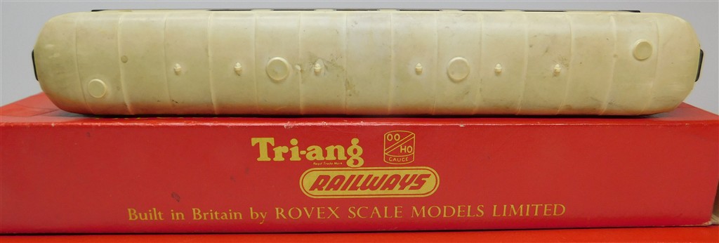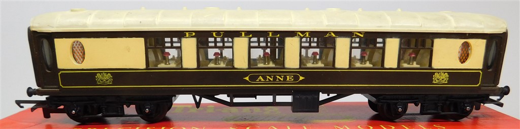 A Tri-ang R228 Pullman car Anne, pink lamp shades, Mark 3 couplings, open axle boxes with deep flanged wheels, grubby roof, in fair condition, supplied in the original box.