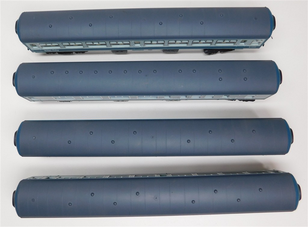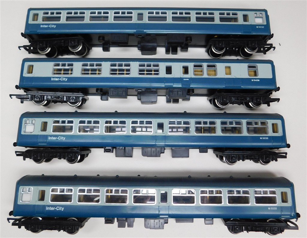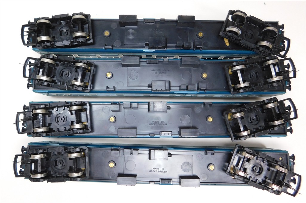 4 Hornby 1970s production blue and grey Mk2 coaches with silver window frames, in good condition, no original boxes.