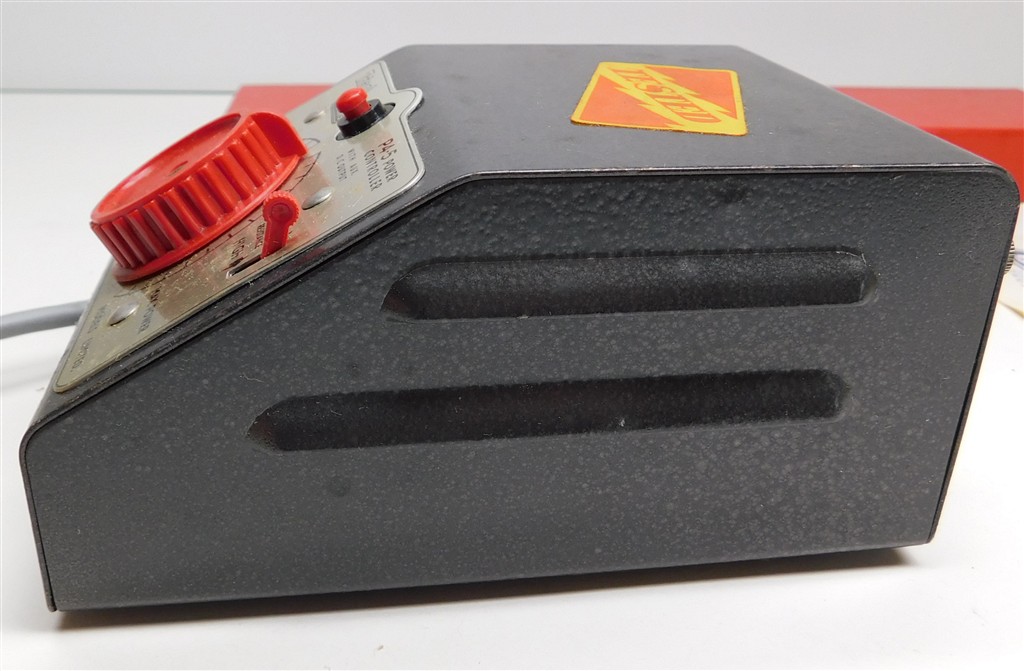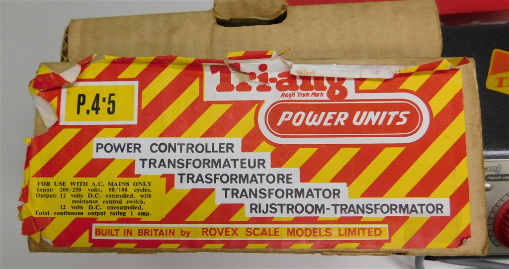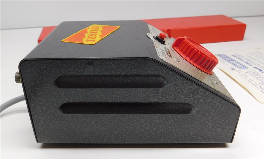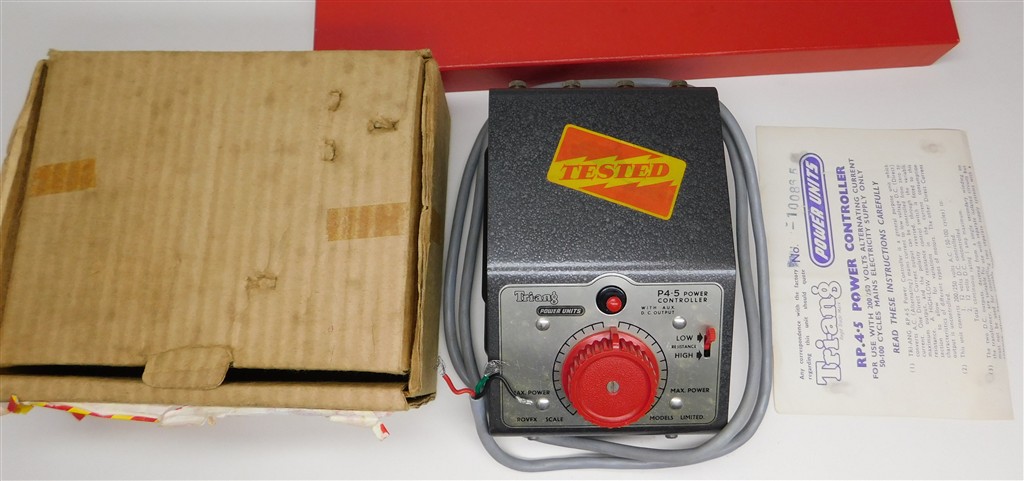 A vintage 1960s production Tri-ang P4.5 Power Controller, untested, in good clean cosmetic condition, supplied in the original box with instructions. Please note that this controller is sold as a display object only for collectors and that if it is to be used it will need to be tested and possibly fixed as it does not meet current electrical safety requirements. We have not tested this controller at all.