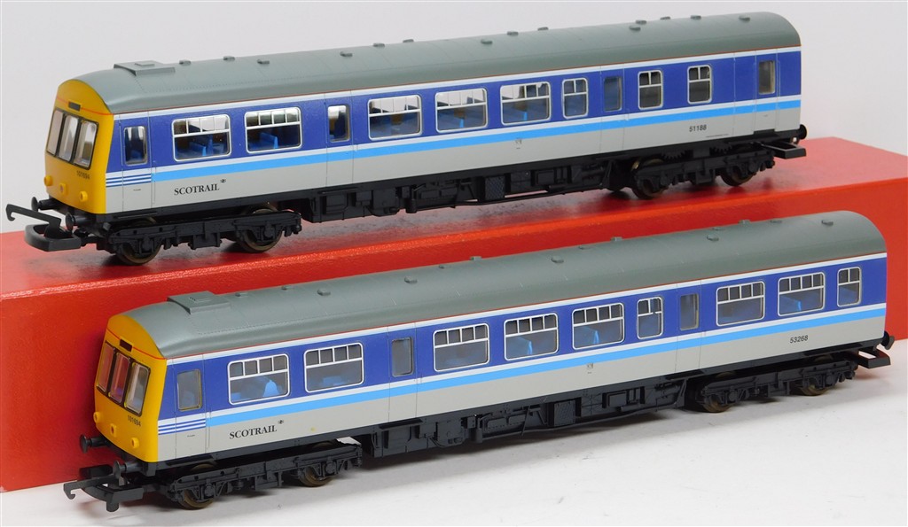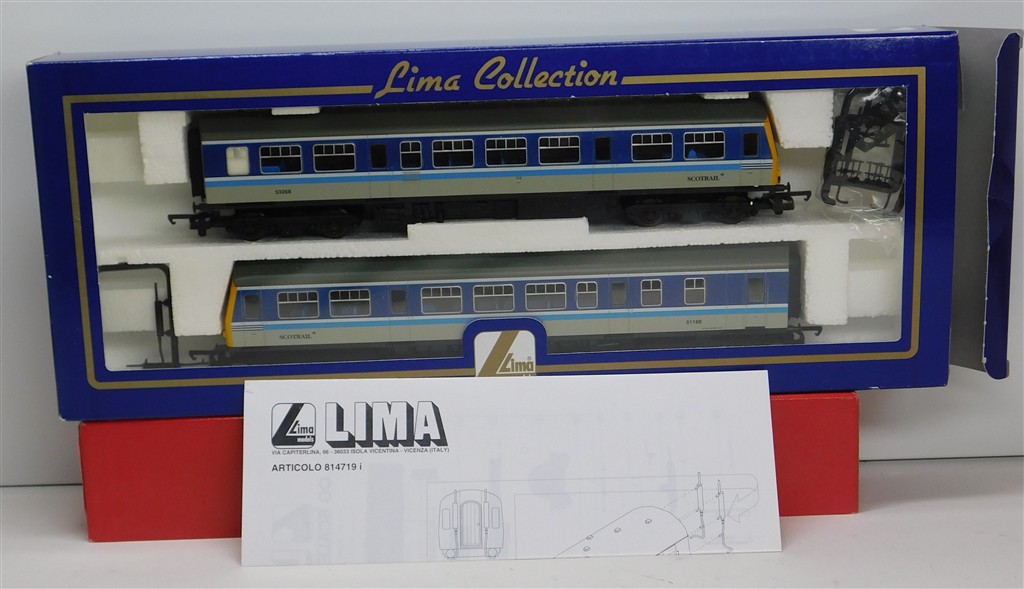 A Lima 149814 BR Scotrail livery class 101 2 car DMU number 53268+51188, good runner, in very good condition, supplied in the original box with instructions.
