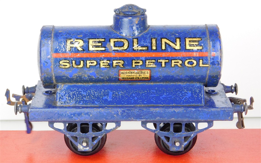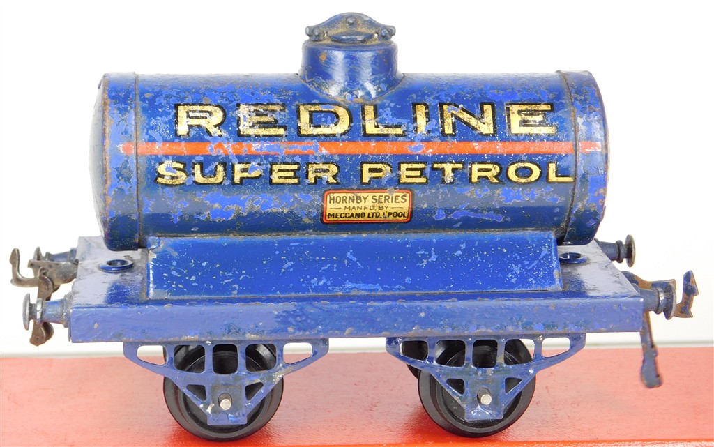 A playworn Hornby O gauge Redline Super Petrol tank wagon, type 2 chassis, no original box.