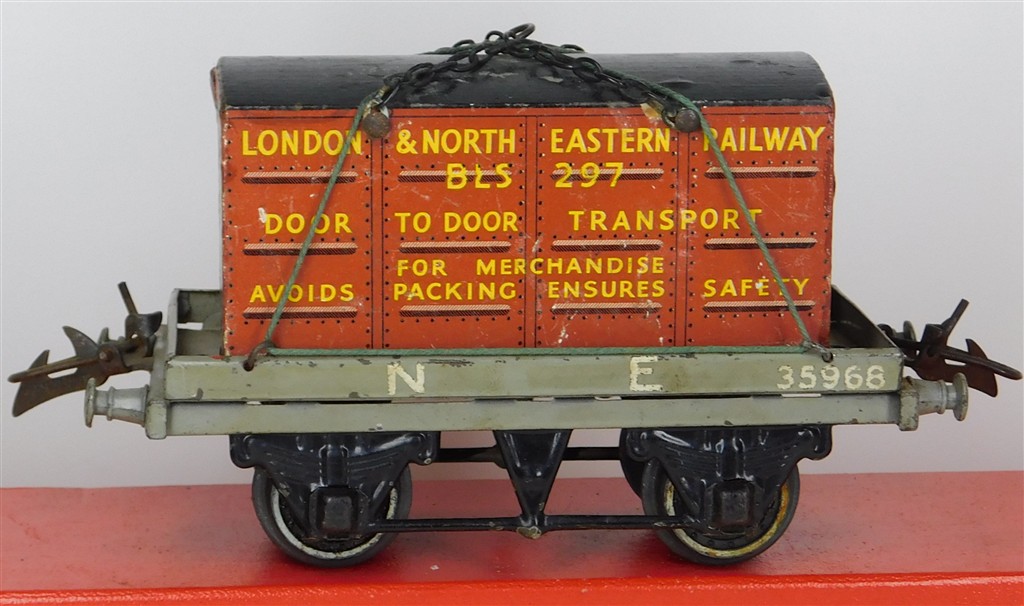 British 0 Gauge : Hornby O gauge NE one plank wagon with container number 35968, grey