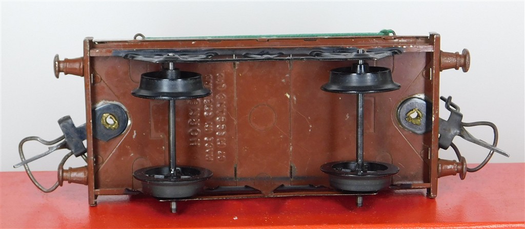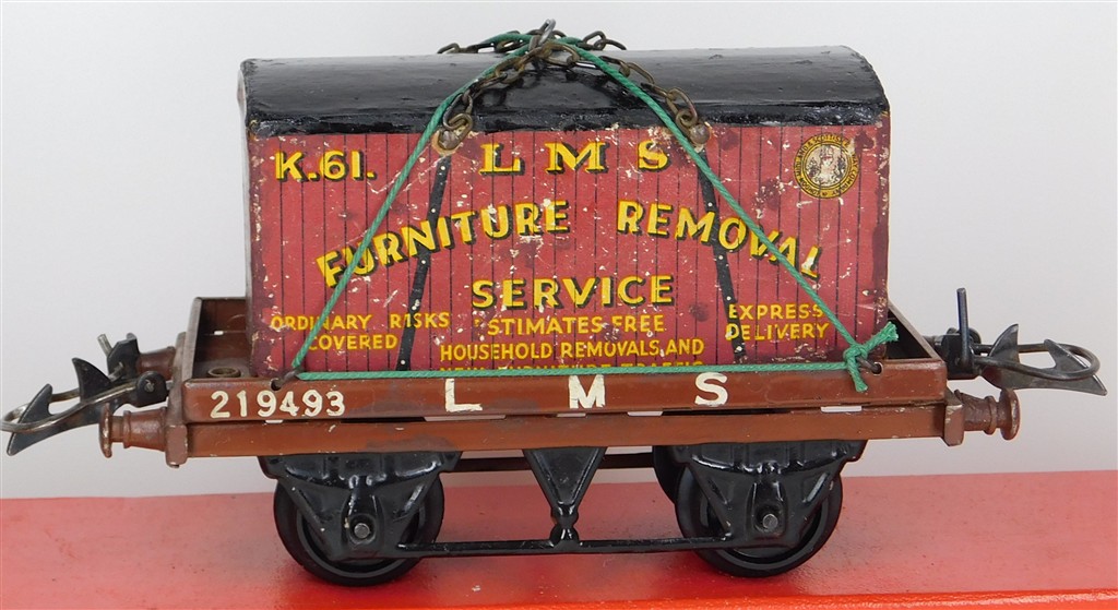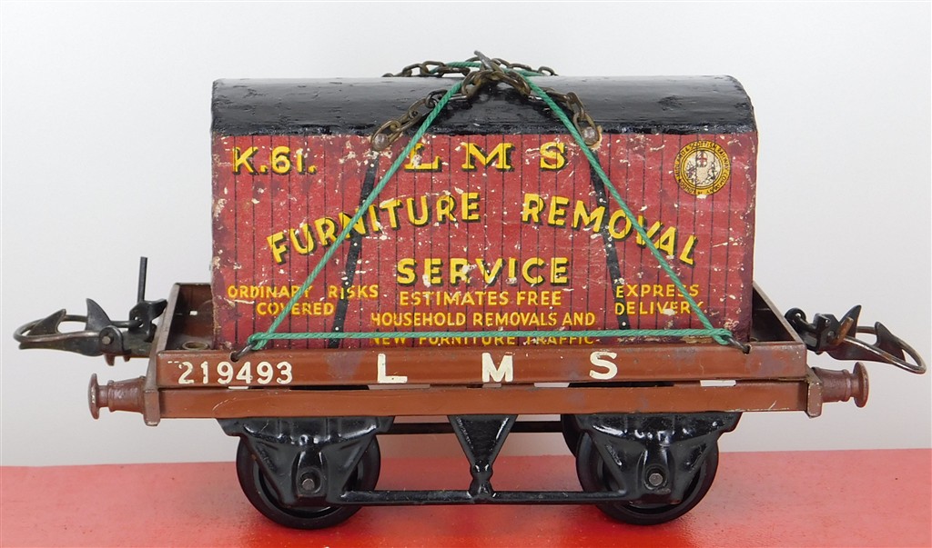 British 0 Gauge : Hornby O gauge LMS one plank wagon with container number 219493, brown