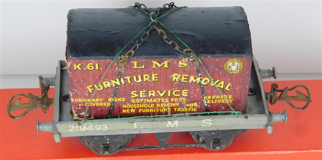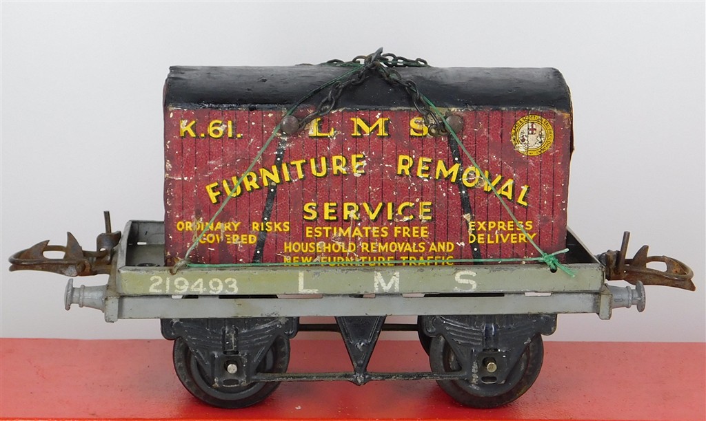 British 0 Gauge : Hornby O gauge LMS one plank wagon with container number 219493, grey