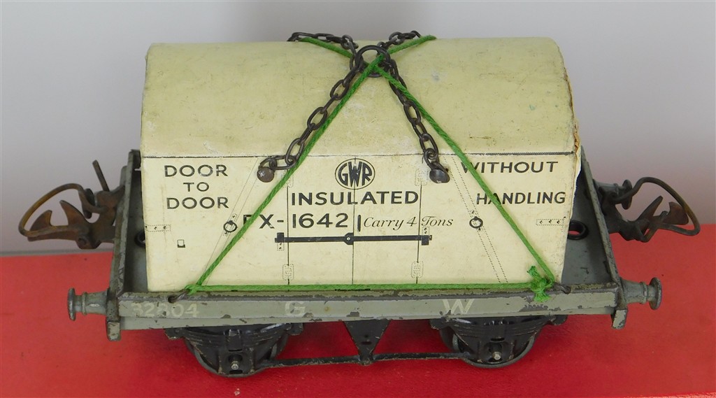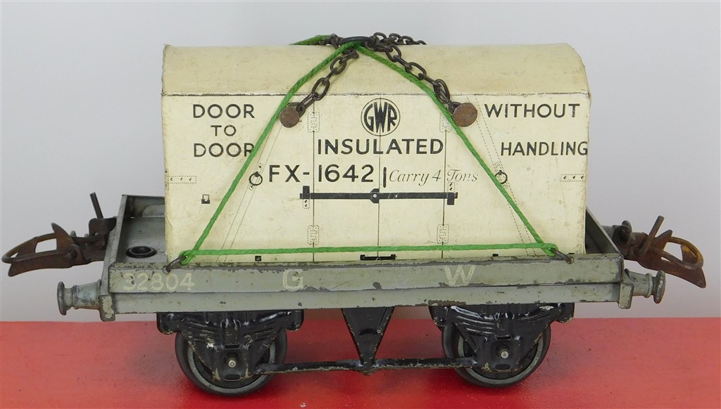 British 0 Gauge : Hornby O gauge GWR one plank wagon with container number 32804, light grey
