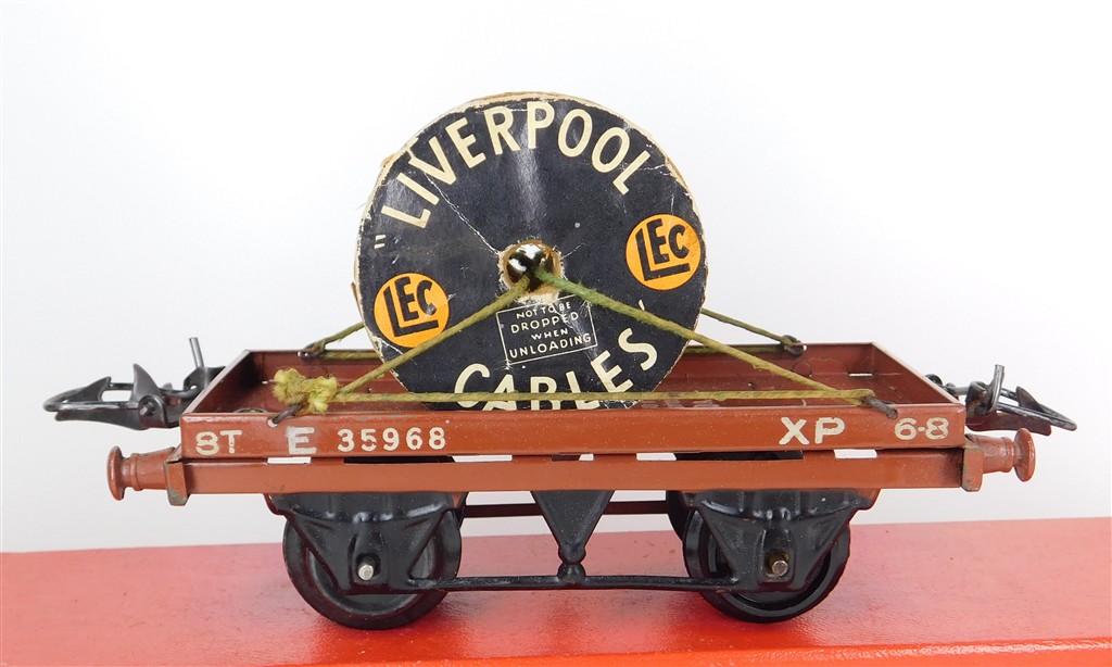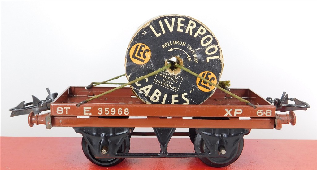 British 0 Gauge : Hornby O gauge BR one plank wagon with Liverpool Cables drum number E35968, brown