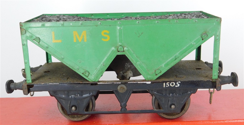 British 0 Gauge : Hornby O gauge LMS green hopper wagon, type 3 chassis, renumbered, 3 link couplings, changed buffers and wheels