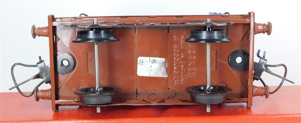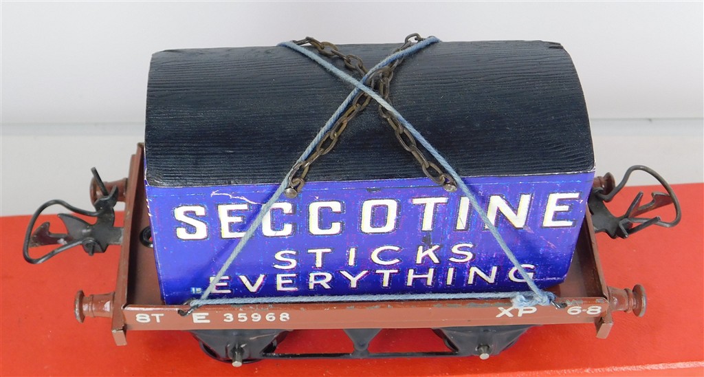British 0 Gauge : Hornby O gauge BR one plank wagon with reproduction Seccotine container number E35968