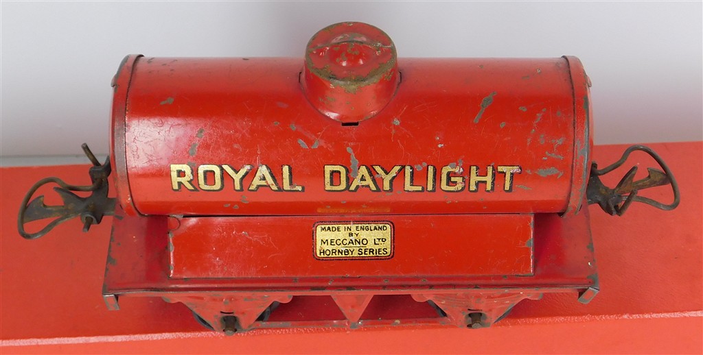 A playworn Hornby O gauge Royal Daylight tank wagon, type 3 chassis, no original box