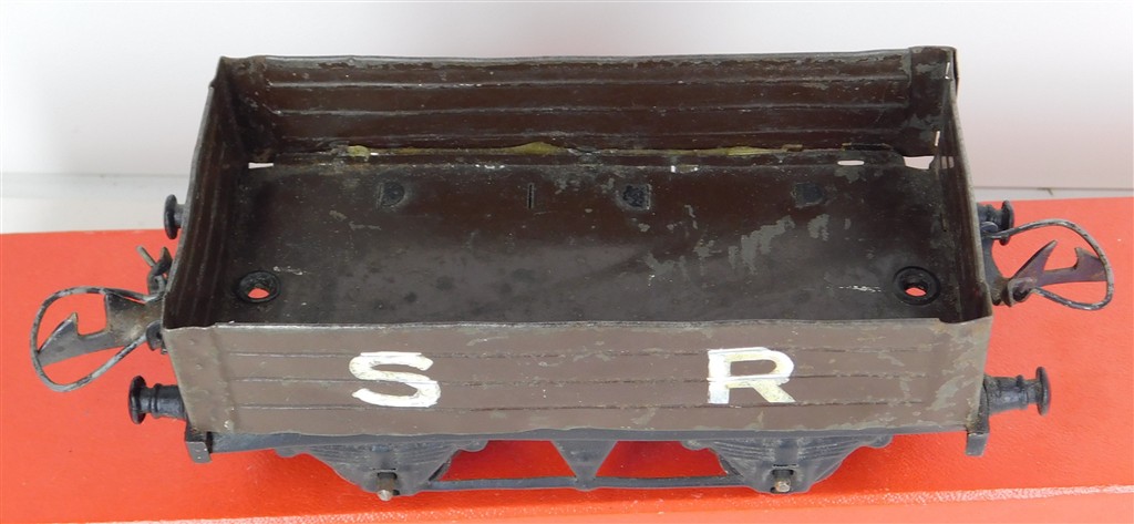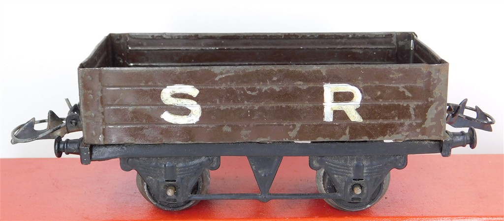 A playworn repainted Hornby O gauge SR open wagon, hand lettered, no original box