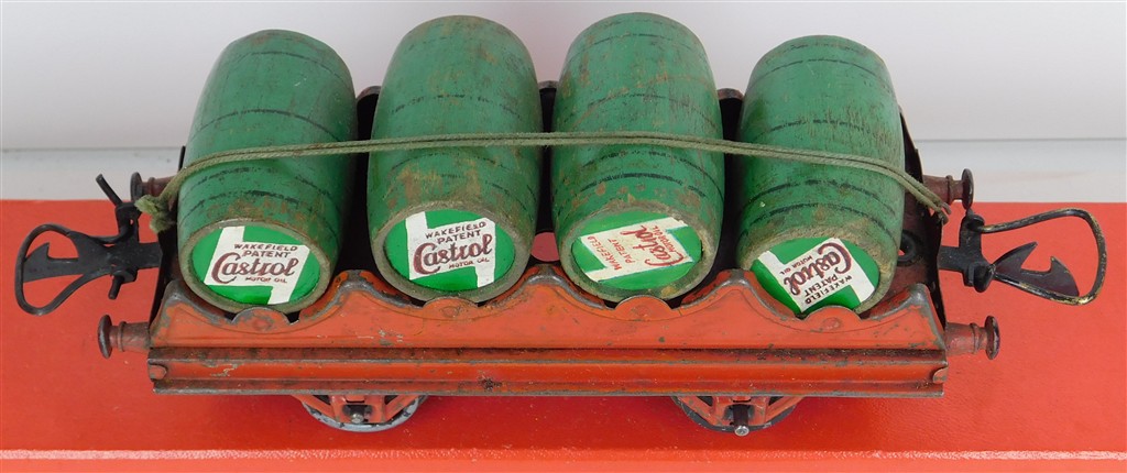A playworn Hornby O gauge No.1 Castrol barrel wagon, no original box