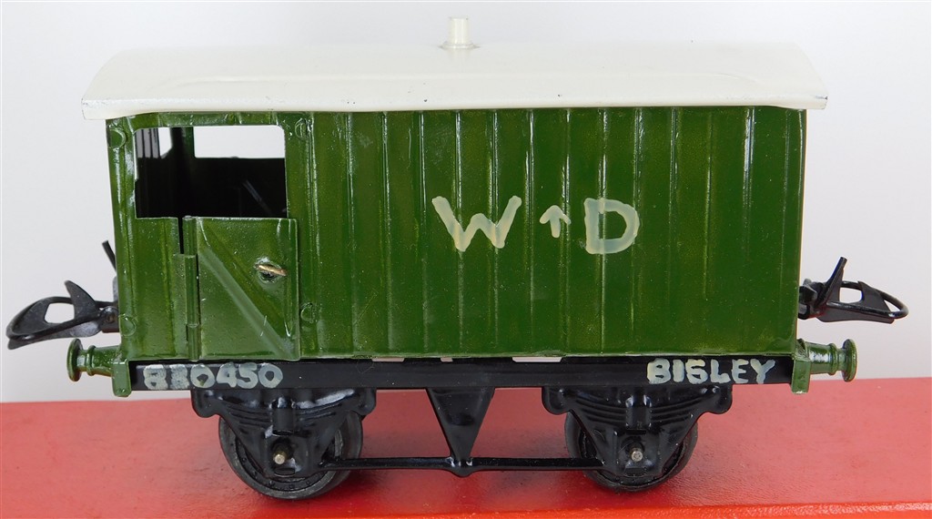 A reasonably well repainted Hornby O gauge WD (War Department) brake van, type 3 chassis, hand lettered, no original box