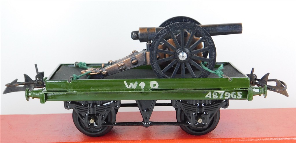 British 0 Gauge : Repainted Hornby O gauge WD (War Department) one plank wagon with cannon load, type 3 chassis