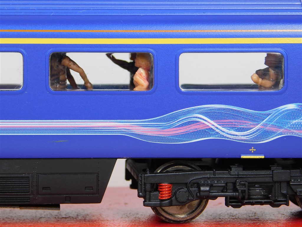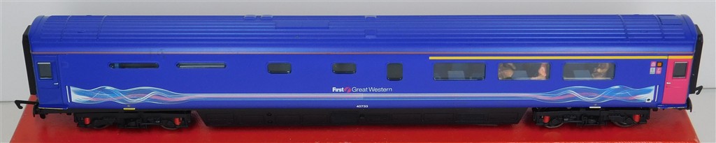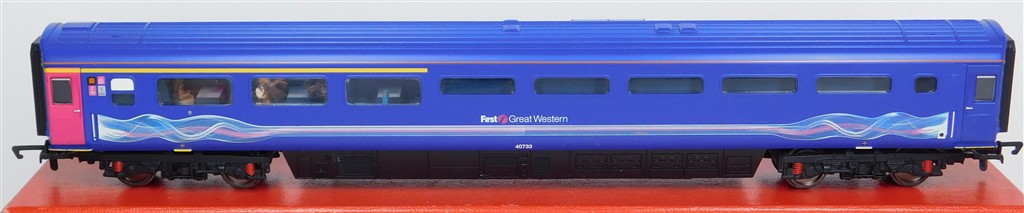 A Hornby scale length First Great Western Mk3 buffet coach 40733 with added weight underneath, mark on one side, badly added figures inside, in good used condition, no original box. (A)
