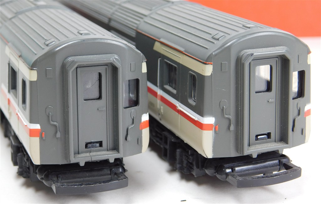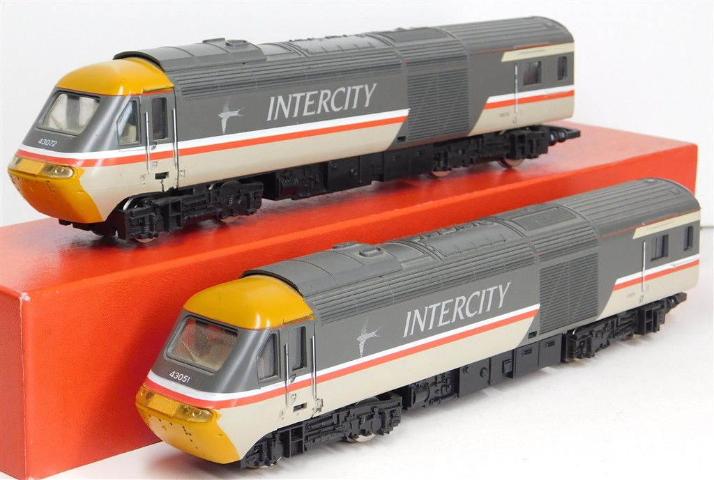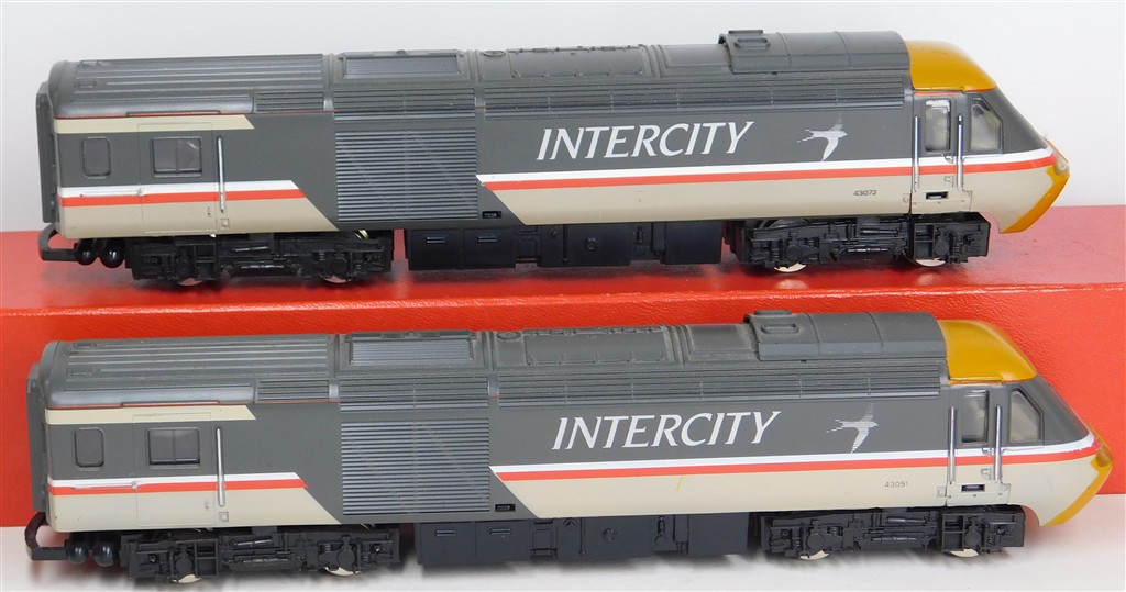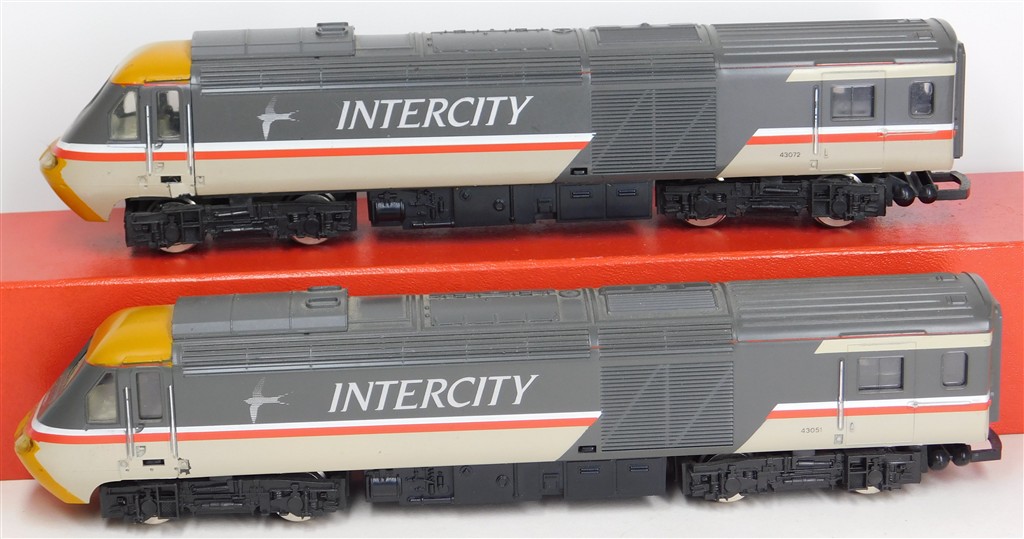 A Hornby ringfield motor InterCity 125 pair including power and trailer car ends, tested and in working order and good condition, no original box, non-directional headlight in power car, directional headlight in non-powered power car, please note a centre coach will be required to run this set.