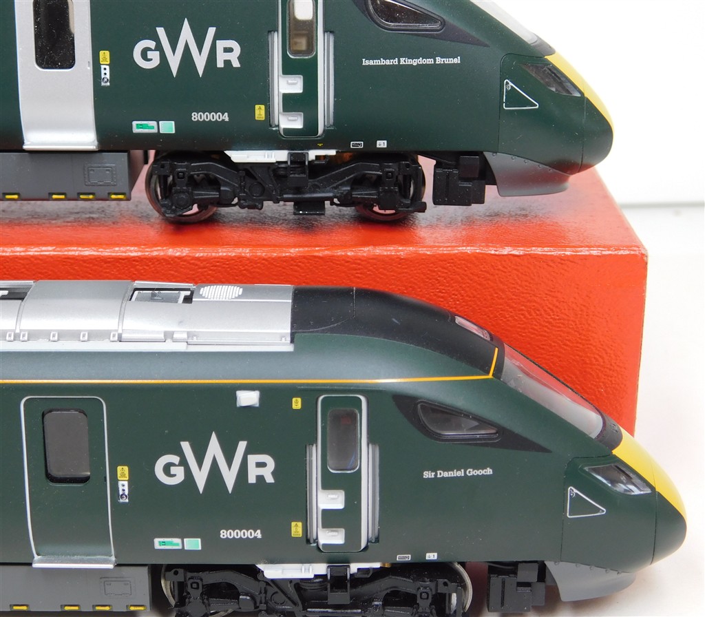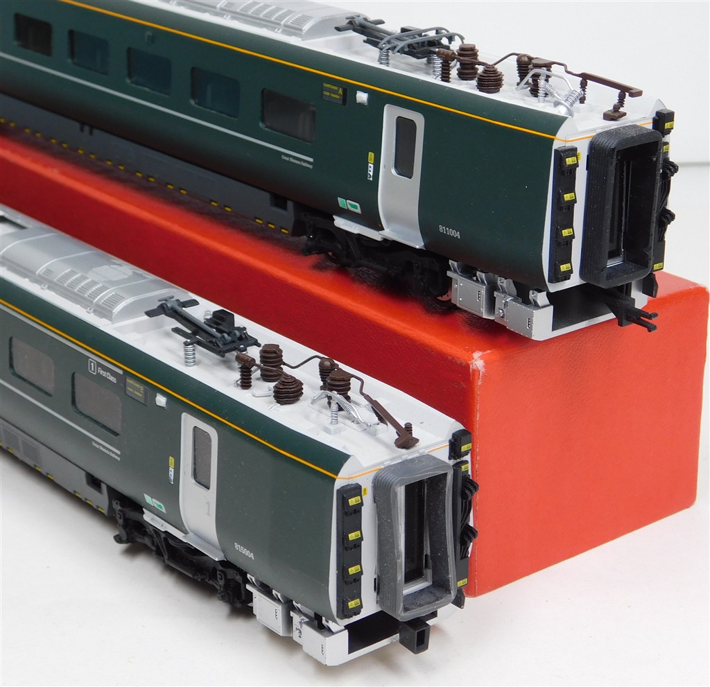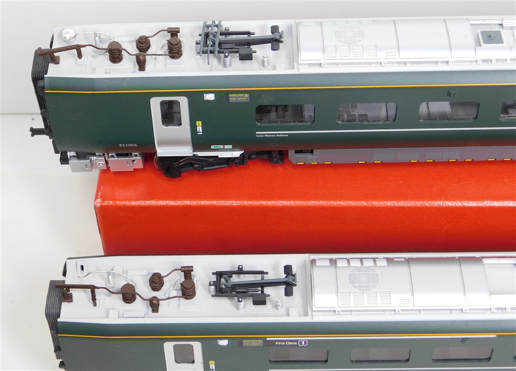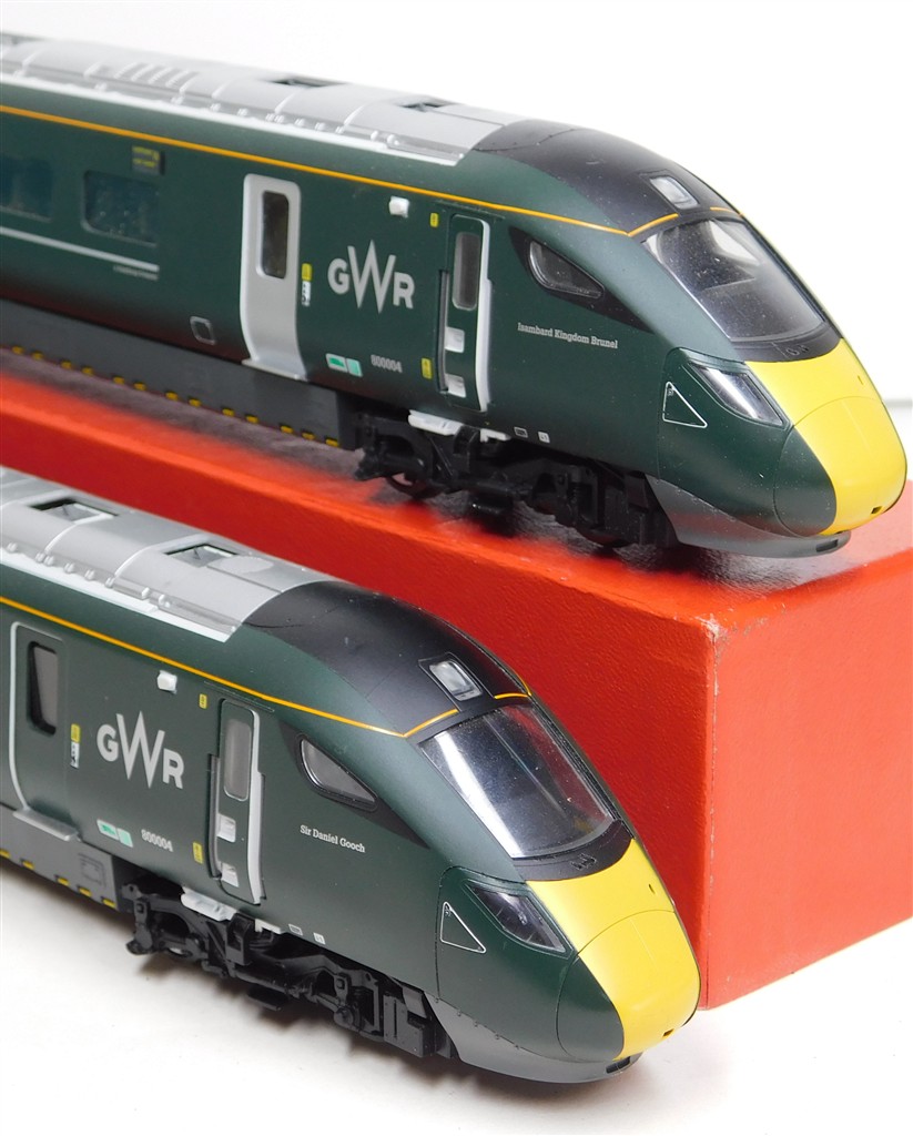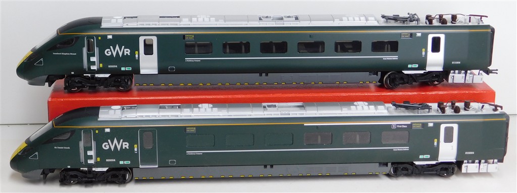 A Hornby GW Class 800 power and trailer car ends, tested and in working order, directional headlights in powered car, interior lights in non-powered car, missing some parts of one pantograph and some isolators otherwise in good condition, no original box.