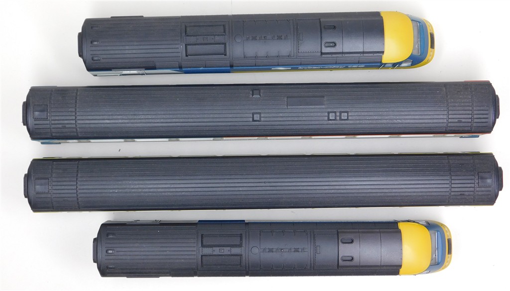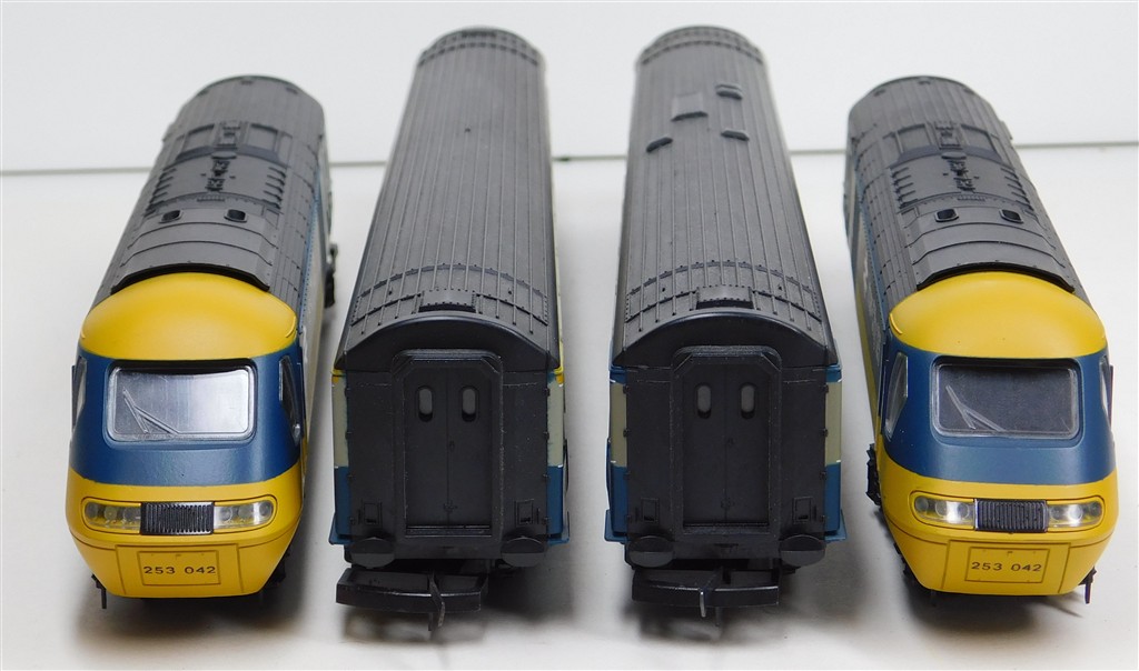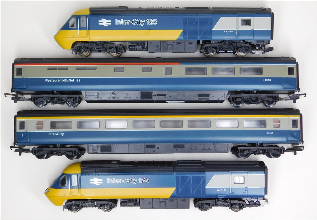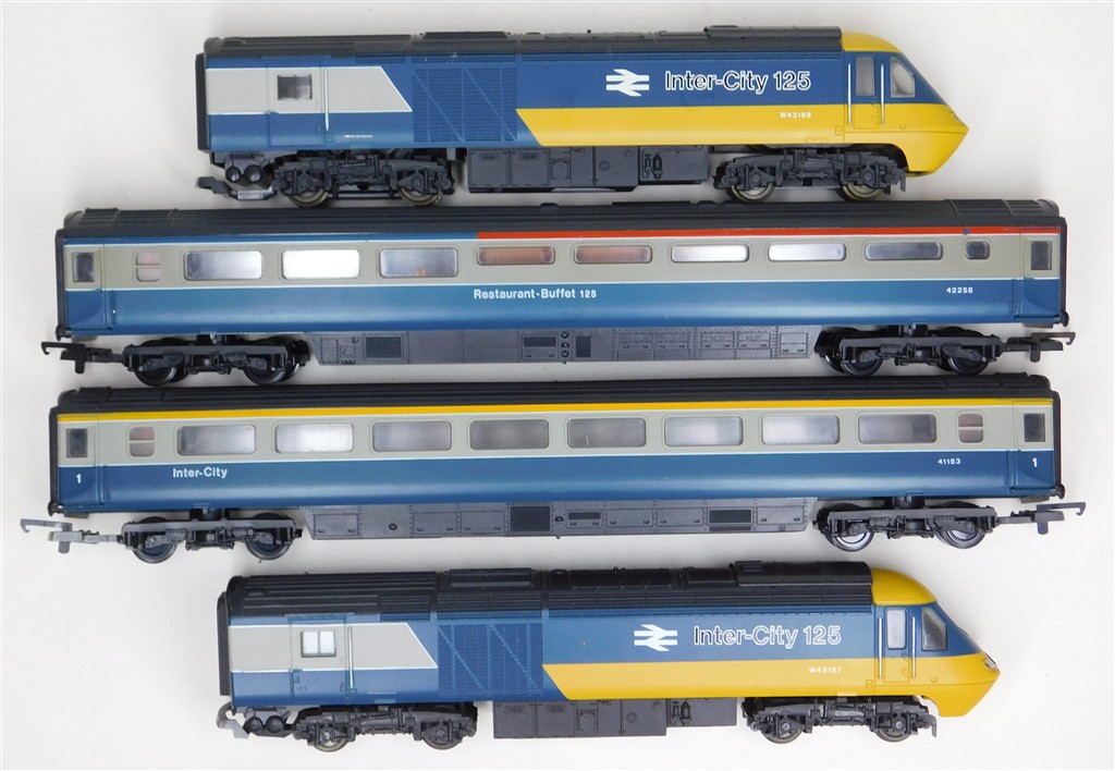 A Lima classic 4 car InterCity 125 set consisting of power car, driving trailer and 2 scale length centre coaches, tested and in working order and good condition, non-directional headlights in power car, no headlights in non-powered power car, no original box