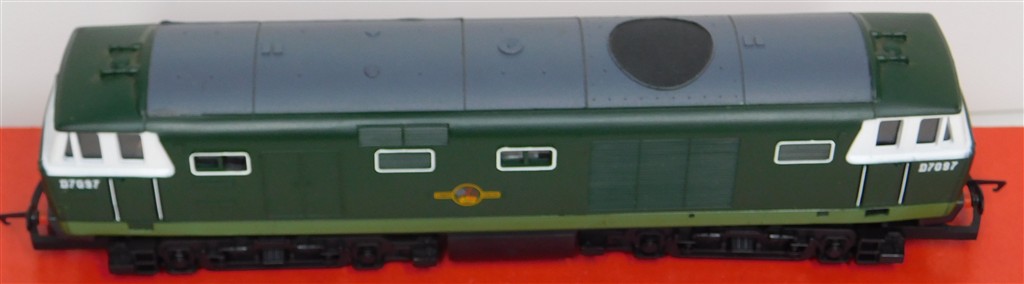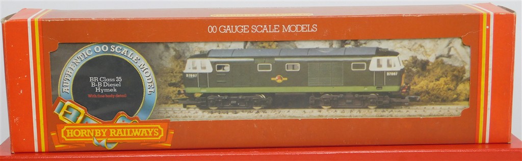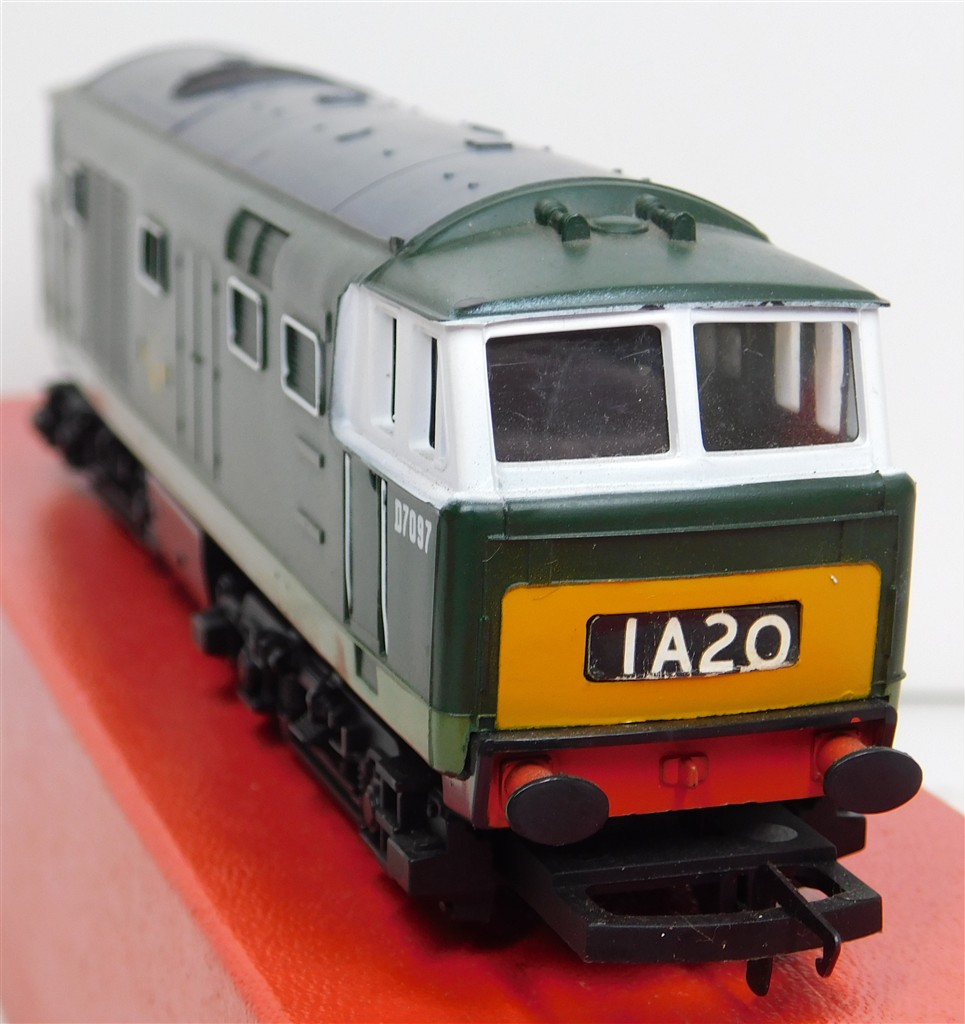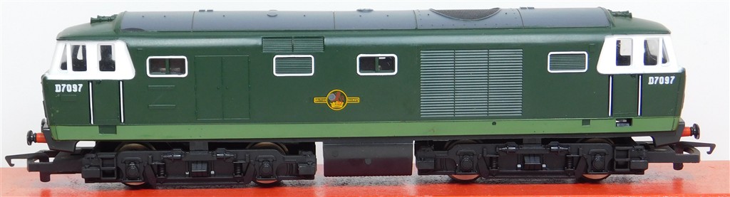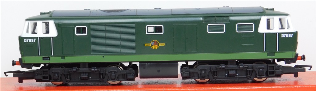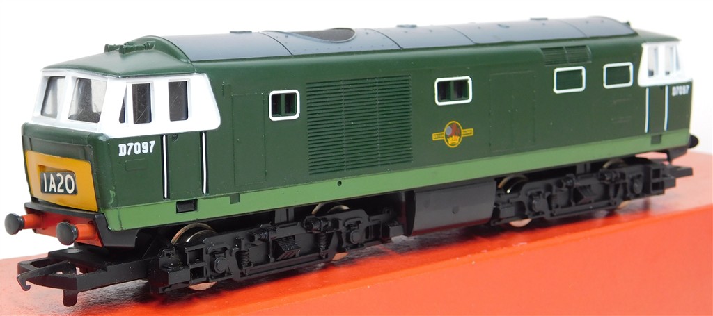 A Hornby R335 ringfield motor BR green Hymek class 35 diesel loco number D7097, good runner, wonky front headcode and slight paint loss otherwise in good condition, supplied in the original box