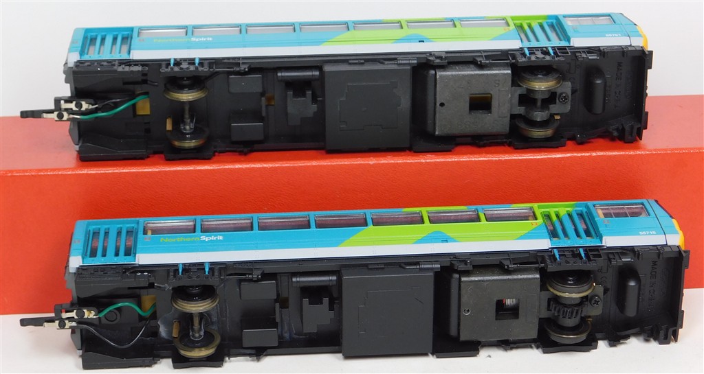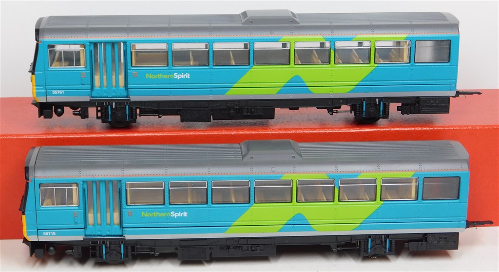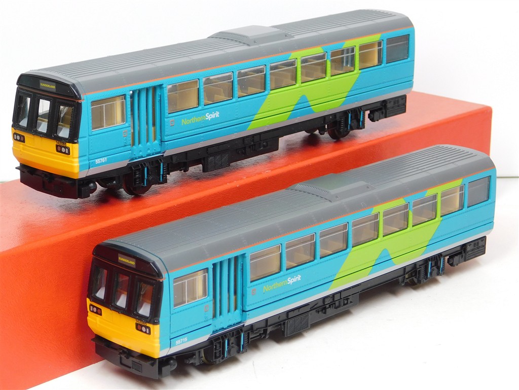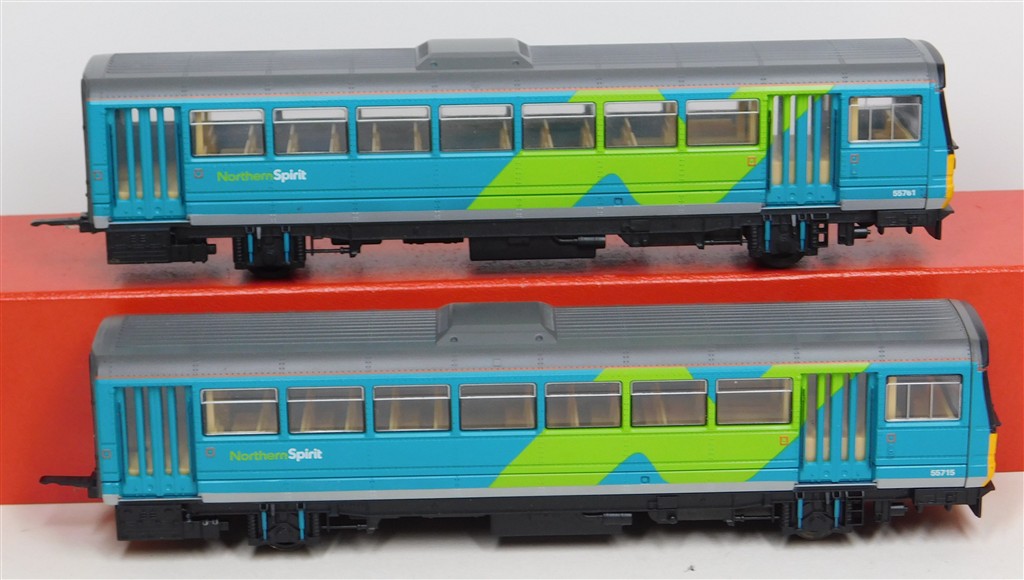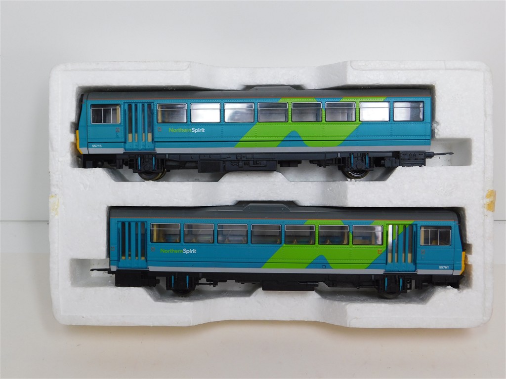 A Hornby Northern Spirit class 142 Pacer railcar set number 142 065, good runner: single power car version so needs careful acceleration and both cars to be connected together to run well, in good condition, supplied in the original box polystyrene tray only