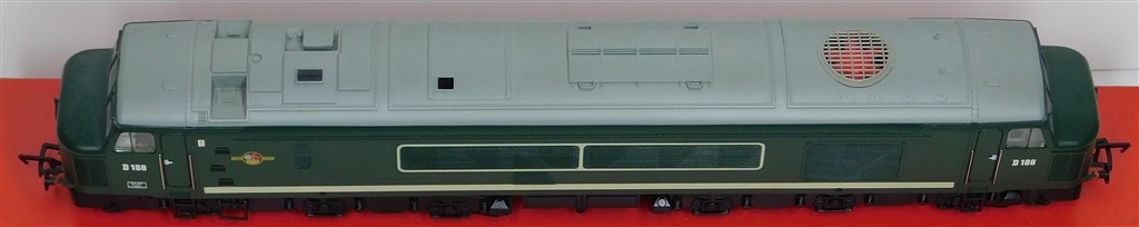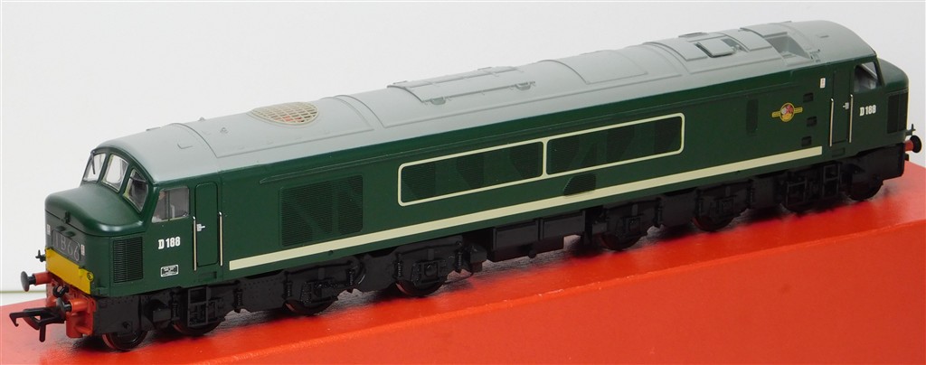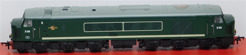 A Bachmann 32-702 BR green class 46 Peak diesel loco number D188, good runner with directional head and tail lights, in very good condition but one cab window has been pushed in and needs refitting, supplied in the original box with unopened detail pack, with instructions. Note that the model states DCC fitted but the DCC chip has been removed and a blanking plate fitted for DC (analogue) use.
